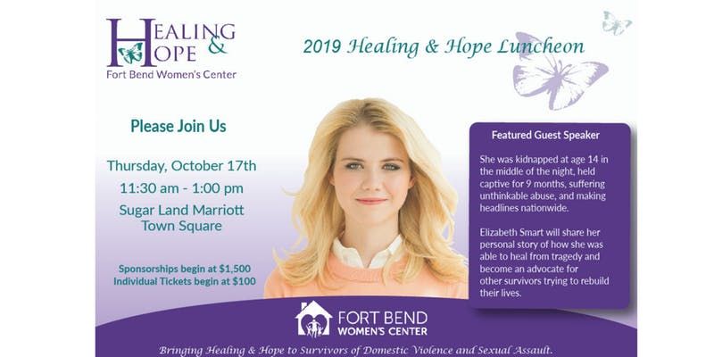 Join us on October 17, 2019 at Sugar Land Marriott Town Square for the 4th Annual Healing & Hope Luncheon, featuring Survivor and Missing Children Advocate, Elizabeth Smart.